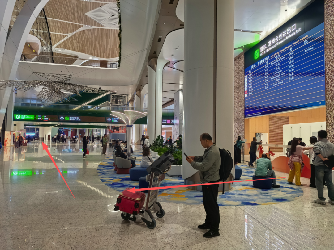 ● 到达T3航站楼与交通中心一层连接口部,跟随航站楼“出口”标识指引,继续前行,进入交通中心一层。