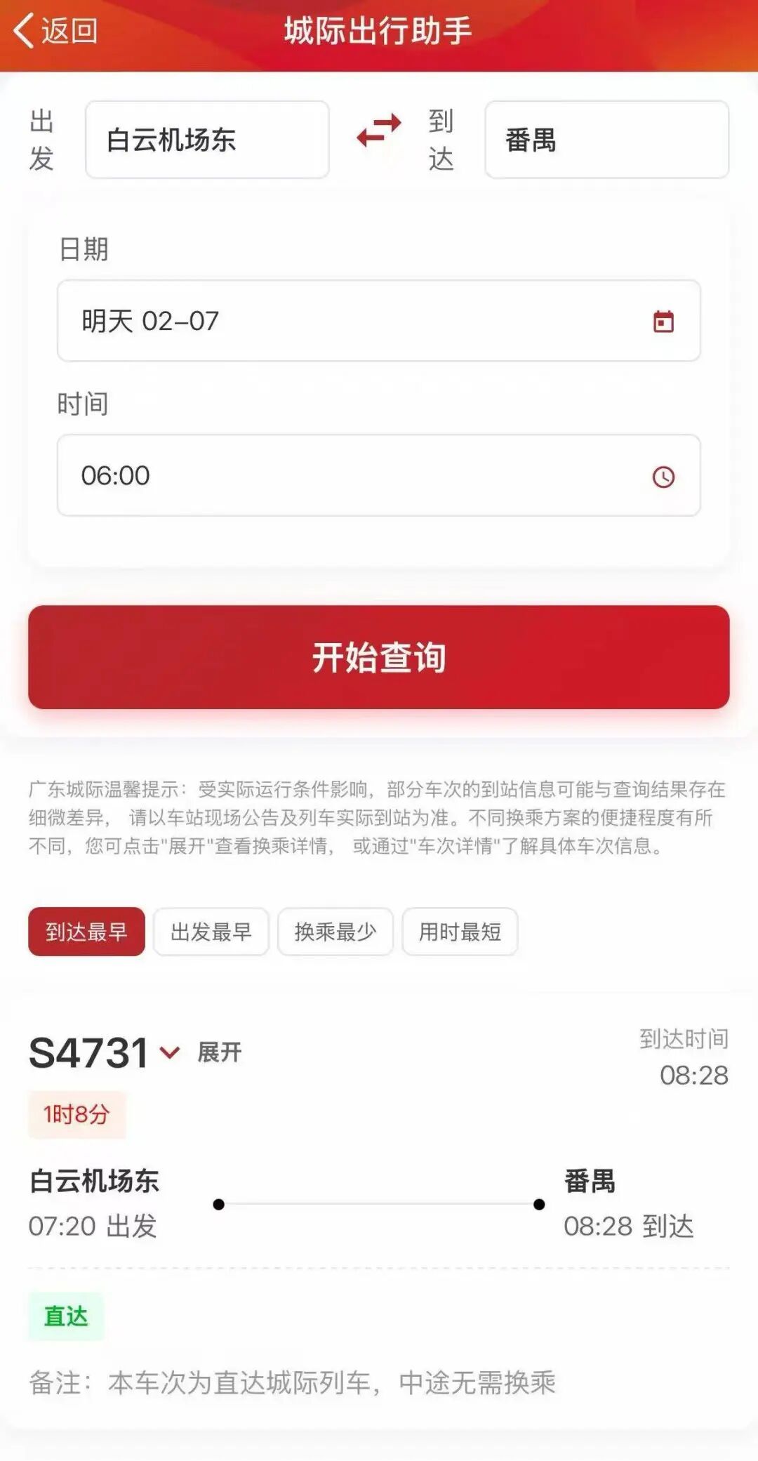 可通过广州地铁APP“城际出行助手”、广东城际官方微信公众号“城际出行助手”“运营时刻表”子栏目或铁路12306查询列车时刻表,现场可通过车站显示屏等确认列车开行时间。“城际出行助手”目前支持查询广惠、广肇、广清、广州东环、琶莲和穗深城际等线路信息。