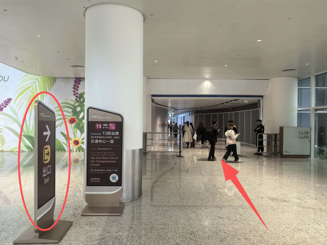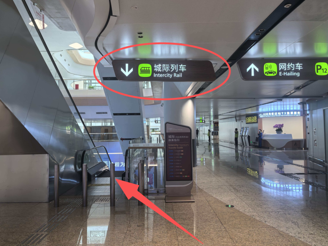 ● 旅客到达白云机场T3航站楼的国际或国内到达出口后,跟随“城际列车”灯箱标识指引,往交通中心一层方向前行。