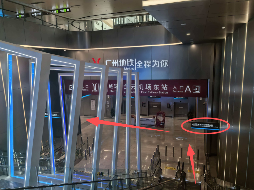● 进入交通中心一层,留意“城际列车”灯箱标识指引,跟随箭头指引搭乘向下扶梯,找到城际白云机场东站入口。携带大件行李或推婴儿车等旅客可以向前走30米,搭乘无障碍电梯至负二层。