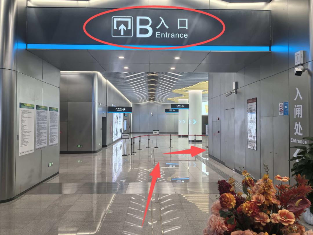 ● 到达站厅后,根据墙面标识,从A出口或B出口出闸机往交通中心方向前行。
